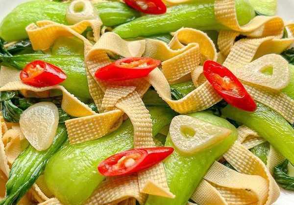 準備食材:油菜,豆皮,蒜片,小米辣。