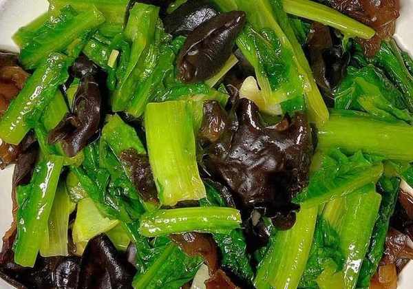 3、起鍋燒油,油熱後放入蒜末爆香,再放入油麥菜翻炒一會兒,炒至斷生後放入木耳炒均勻。
