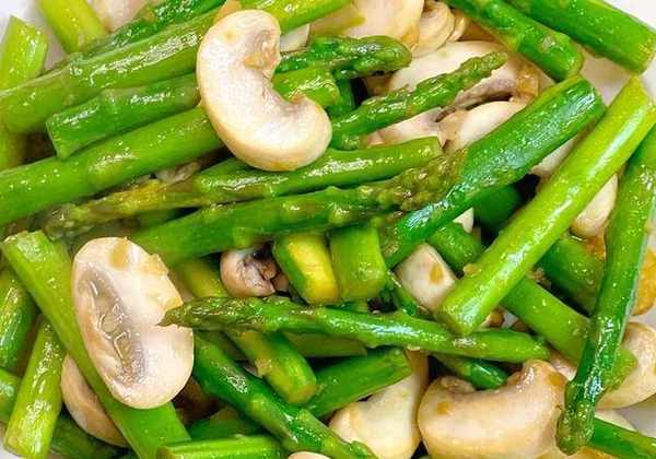 3、起鍋燒油,油熱後放入蒜末爆香,再放入口蘑翻炒一會兒,炒軟後放入蘆筍翻炒均勻。
