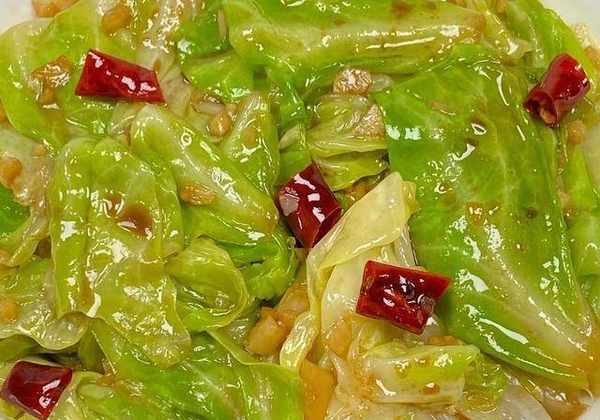 2、起鍋燒油,油熱後放入蒜末和幹辣椒爆香,再放入包菜翻炒均勻,炒至包菜微軟,加入生抽、陳醋、蠔油、白糖、食鹽和雞精調味,翻炒均勻入味,炒熟即可出鍋裝盤開吃。