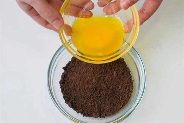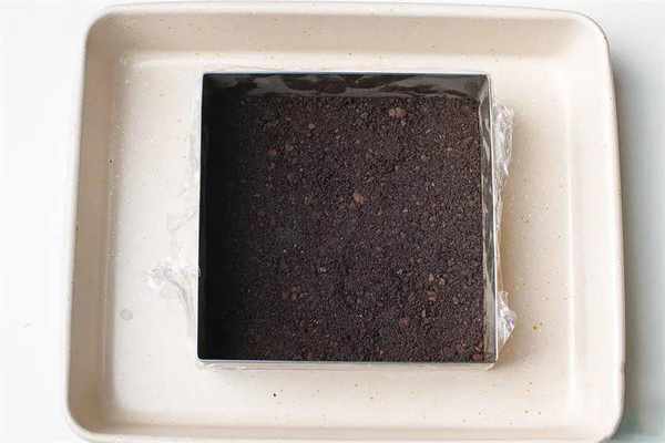 - 將奧利奧餅幹放入一個密閉的塑料袋中,用搟面杖將其壓碎成碎末。將碎末放入一個大碗中,加入融化的黃油,拌勻。