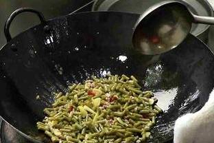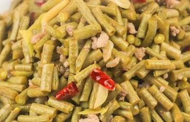 鍋中加入適量的水,大火煮開之後,裡面再加入適量的鹽和白醋。然後再將醋鹽水倒入豆角盆中,蓋上蓋子之後進行浸泡一天,之後再將泡好的豆漿撈出來,切成斷狀。鍋中加入適量的油,然後再將肉末放入鍋中進行翻炒至變顏色。然後再將我們切好的豆角段放入鍋中。