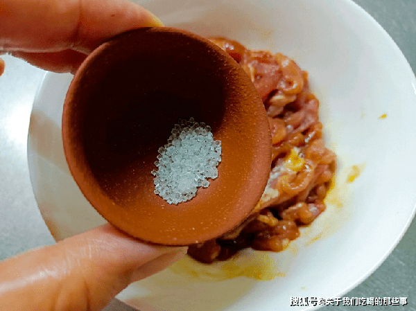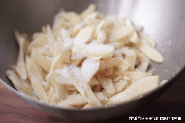 2、把薑片放入幹凈的盆中,加入適量鹽,薑和鹽的比例是20:1,用手翻拌均勻,醃制2小時,殺出仔薑的水分,再用清水沖洗掉多餘的鹽分,瀝幹水分備用。