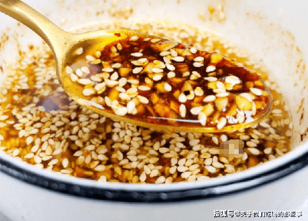 3、碗裡放入蒜末、辣椒面、熟白芝麻,鍋裡倒入適量油燒熱,潑入碗中熗出香味,加入食鹽、生抽、香醋、白糖、香油攪拌均勻。