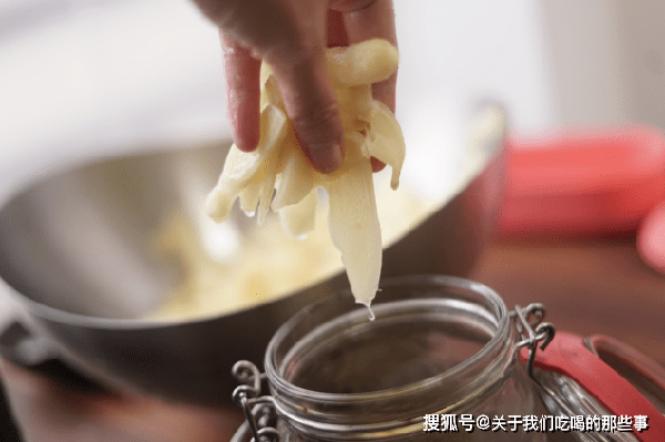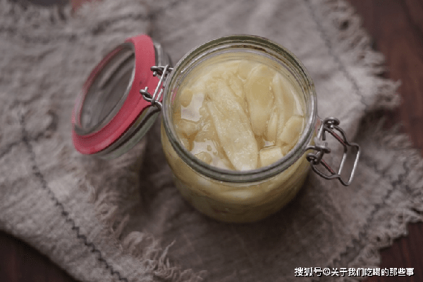 3、玻璃瓶提前用開水煮一下消毒殺菌,晾幹水分。把瀝幹水的仔薑片放入玻璃瓶,根據個人口味加入適量冰糖、白醋,白醋要沒過仔薑才行,蓋上蓋子醃制一個晚上即可食用。