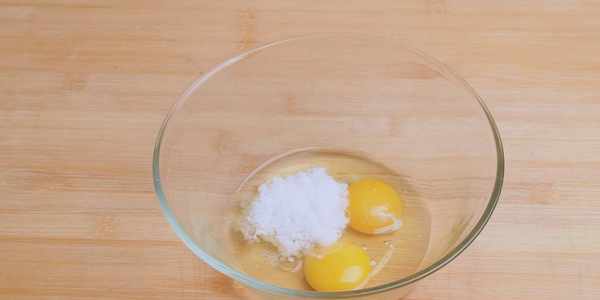 1:首先在碗中打入兩顆雞蛋,再加入15克的白糖