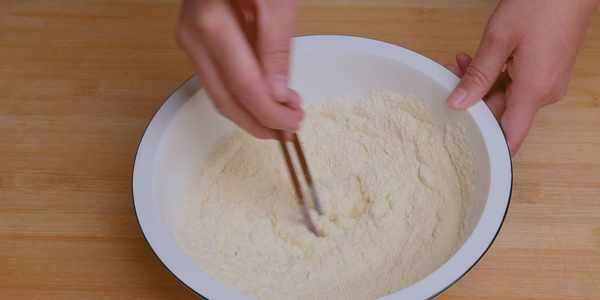 5:在150克普通面粉裡面加入60克的玉米面粉,然後用筷子把它們充分攪拌均勻
