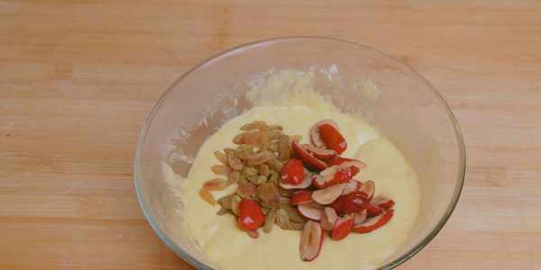 10:然後加入準備好的葡萄幹和紅棗碎,然後再次翻拌均勻