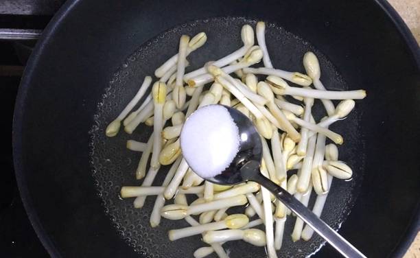 第五步:不用洗鍋,直接再下一點底油,把花生芽倒入鍋裡,放入精鹽4克,白糖2克,翻炒均勻。