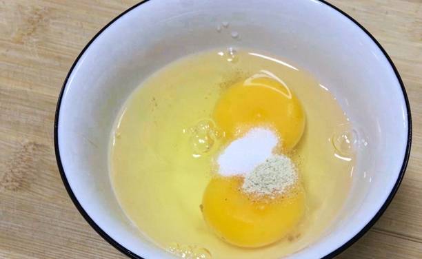 第一步:把雞蛋敲入碗中,加入精鹽3克增味,胡椒粉2克去腥提鮮,加入50克清水,用筷子攪化備用。