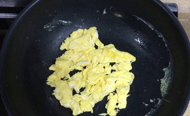 第四步:熱鍋下一點底油,油熱後倒入雞蛋,炒至凝固弄成小塊盛出。
