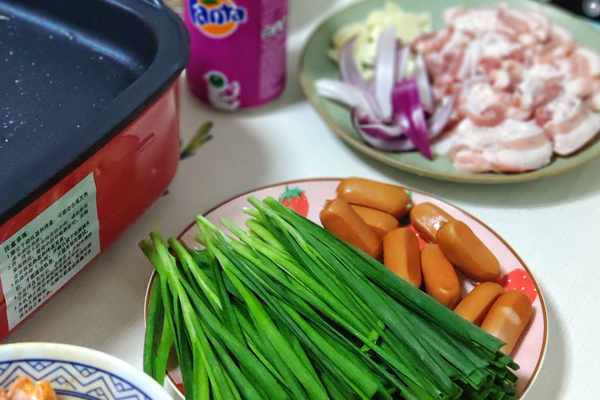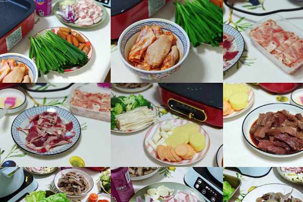 今天每種食材的準備的量不多,但是品種不少,大概有14種,有牛扒、五花肉、雞中翅、蝦、肥牛、雞胗、粒粒腸、土豆、紅薯、金針菇、淮山、西蘭花、生菜、韭菜等。還要準備食用油、鹽、辣椒粉、胡椒粉、蒜蓉辣醬等放旁邊,隨時備用。