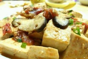 2.炒鍋洗凈控幹水,開火倒入食用油,油燒冒小泡時,放入蔥絲、蒜子爆出香味,然後放入一勺豆瓣醬炒出香味,接著放入西紅柿丁、香菇片、青紅辣椒段,大火快速翻炒均勻,大概一分鐘,放入嫩豆腐片,接著放入醋、食用鹽,沿著鍋邊放入適量清水煮2分鐘,煮開後關火,放入小蔥花即可食用。