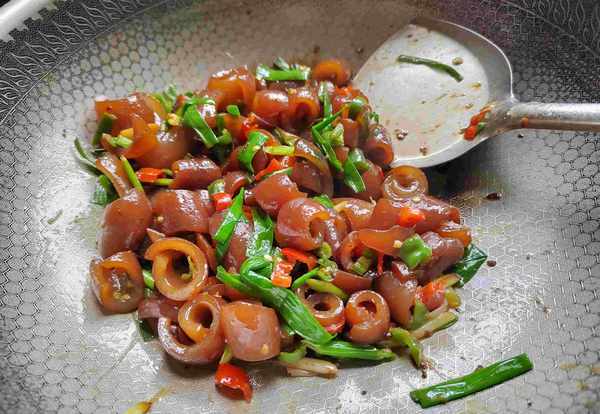 起鍋燒油,放入蒜梗和青紅辣椒爆炒一會兒,加入鹽炒勻,再放入鹵豬皮翻炒,加入少許生抽和料酒炒勻炒勻即可。
