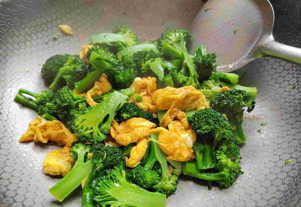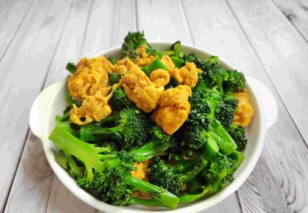 起鍋燒油,倒入打散的蛋液,煎至成型後,放入西蘭花爆炒片刻,加入鹽和生抽調味即可。