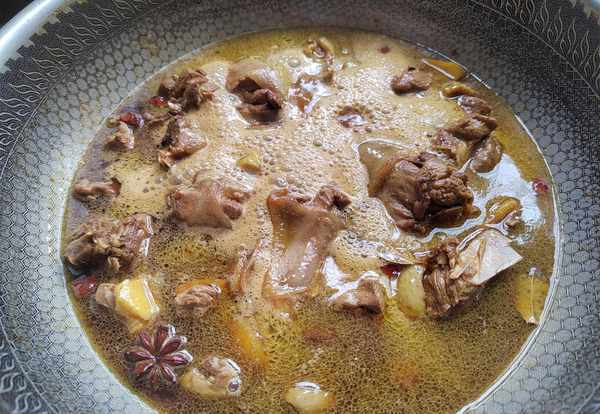 熱鍋倒油,放入鴨肉爆炒片刻,炒至鴨肉微黃後,再放入薑片、八角、桂皮、香葉炒香,加入生抽、蠔油、紅燒醬油、料酒炒勻,再倒入適量清水煮開。