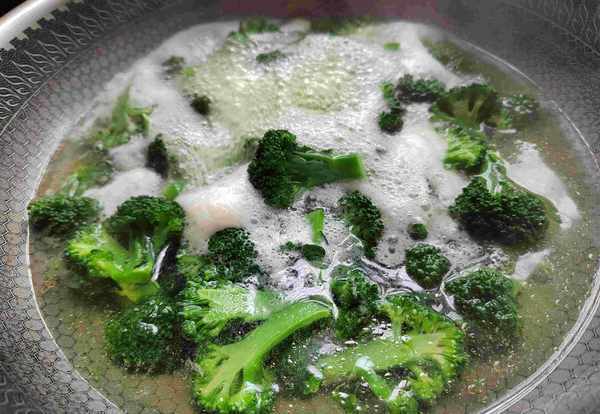 西蘭花沖洗一遍,再用淡鹽水浸泡片刻,放入開水鍋中,加入幾滴食用油,焯水1分鐘,撈起過涼,再瀝幹水分。