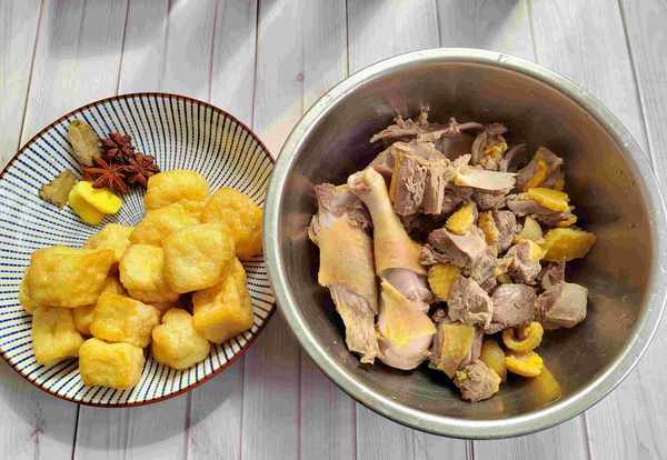 鴨肉和油豆腐分別清洗幹凈,再準備一些八角、桂皮、香葉、薑片。鴨肉冷水下鍋,加入一些料酒和薑片,焯水10分鐘,撈起過一遍冷水,再瀝幹水分。