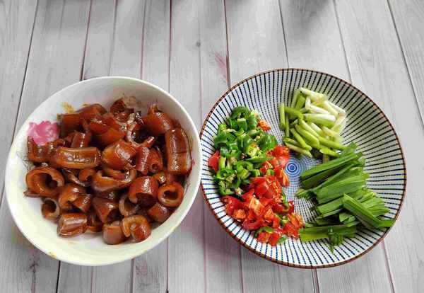 鹵好的豬皮,可以切片裝盤,直接上桌,也可以加些辣椒和蒜苗,做成香辣鹵豬皮。我搭配瞭新鮮的蒜苗和青紅辣椒一起炒。