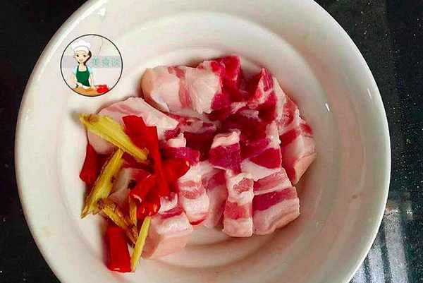 3、洗凈的五花肉切塊,也可以切大塊一些,生薑洗凈切絲、小米辣和大蒜洗凈切段待用。