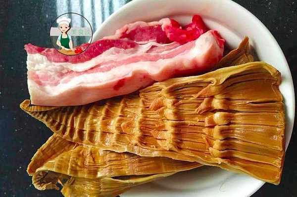 2、筍幹提前泡發洗凈,五花肉把皮刮洗幹凈。