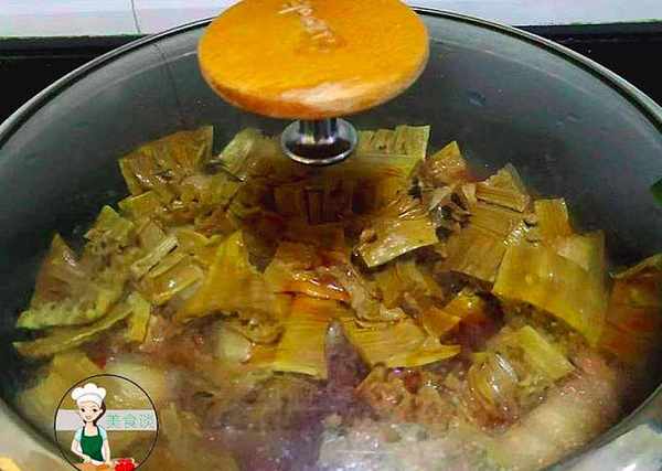 10、蓋上蓋子燜30分鐘左右,五花肉微軟爛,下入少許的鹽調味炒勻即可。(喜歡有嚼勁的可以不用燜太爛)。