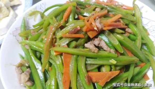 這是一道炒扁蕓豆,也就是豆角的一種,這種豆角扁扁的,將其斜切成這樣子的絲,看起來有點像芹菜絲,但是吃起來卻比芹菜要好吃,特別簡單,普通的傢常菜,好在味道還不錯,吃起來比較下飯。