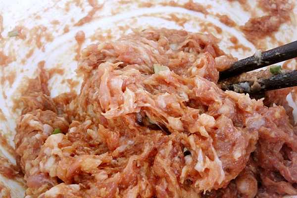 所謂打水就是通過分次給肉中餡中加水,不停的攪拌,讓水分子完全融入肉中,這樣吃起來才更鮮嫩多汁。具體的操作方法是:用泡好的花椒水或者蔥薑水,分2-3次加入肉餡中,每次加入的量不宜太多,用筷子朝一個方向不停的攪拌,直到被肉完全吸收掉,再加第二次水,重復以上動作,直至肉餡變得水嫩飽滿即可。經過反復的打水,肉餡變得松軟但不松散,用它包餃子,吃起來又香又嫩又多汁。