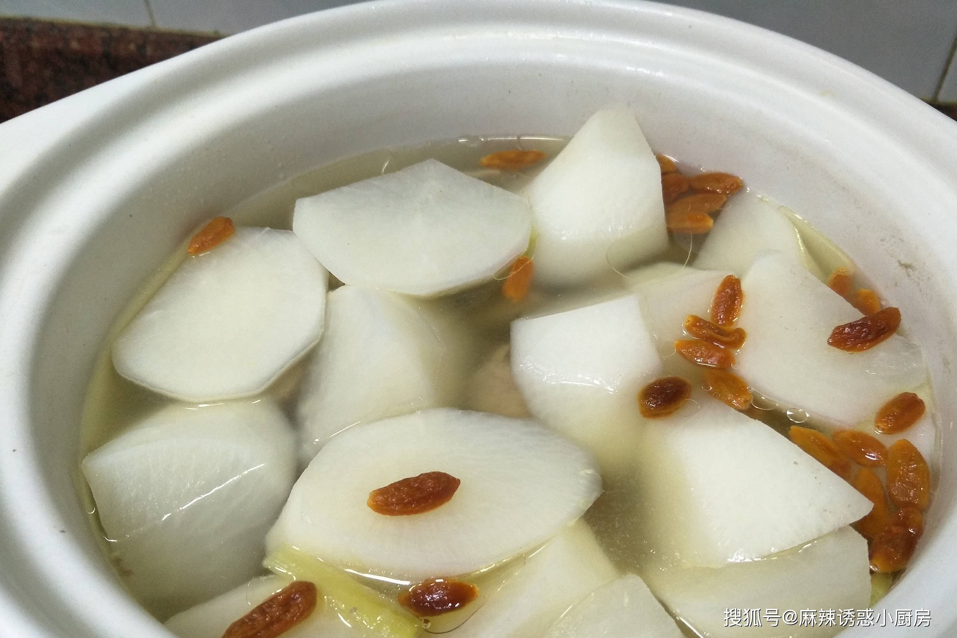 3、燉煮30分鐘後,調至大火,放入白蘿卜塊,繼續燉煮10分鐘至白蘿卜完全熟透即可。