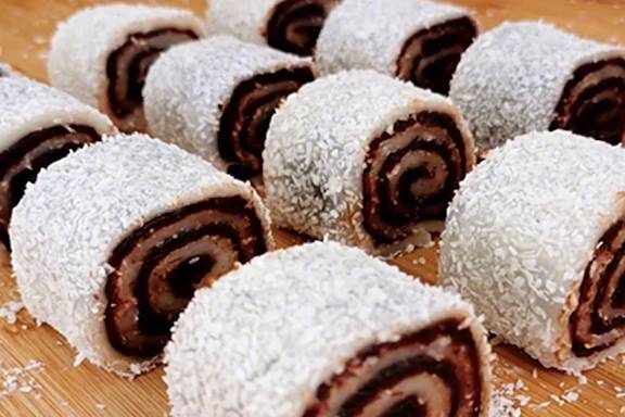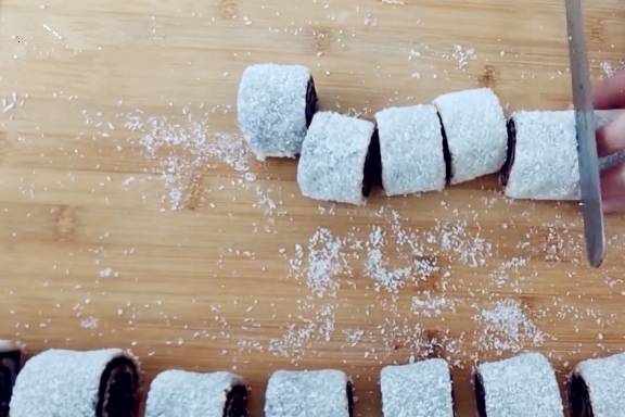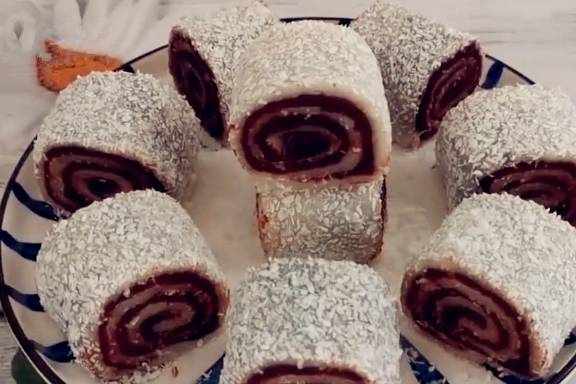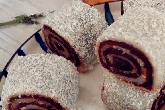 卷好之後,稍微整理一下,用刀把它切成小塊就可以直接吃瞭,我們的糯米豆沙卷就做好瞭,吃起來軟糯香甜,還有濃濃的椰蓉味,非常好吃。是不是非常簡單啊?無技巧,無難度,你學會瞭嗎?