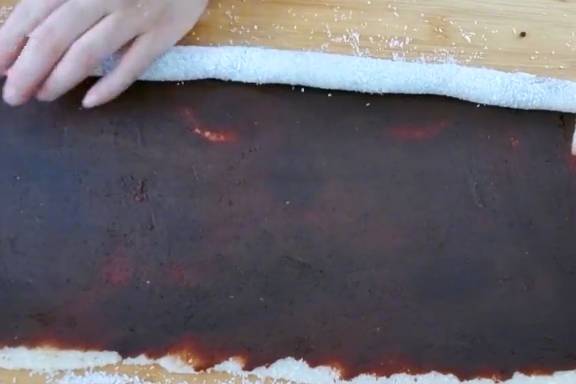 3、用搟面杖搟的時候記得要勤撒椰蓉,不然很容易粘到案板上的。