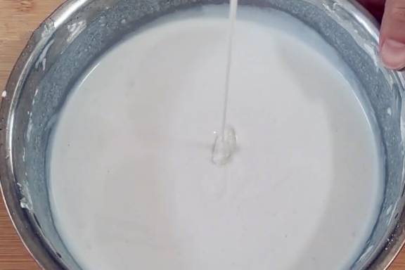首先我們先來準備300克糯米粉,放入盆中,加入30克白糖,再倒入300克純牛奶,邊倒邊攪拌,最後攪拌成流線狀的,比較稀的面糊,如圖這樣既可。