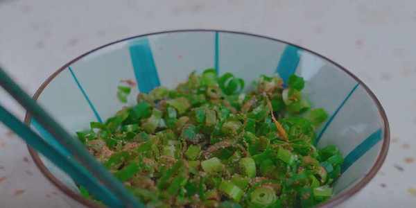 5.準備一把蔥花,放入碗中,調入鹽跟五香粉,攪拌均勻。