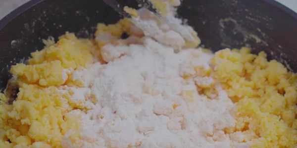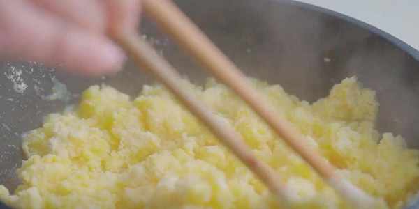 1.鍋中倒入210毫升清水,開大火煮開,水開後關掉火,倒入160克的玉米面。把它攪拌成顆粒狀。放在一邊稍微放涼。