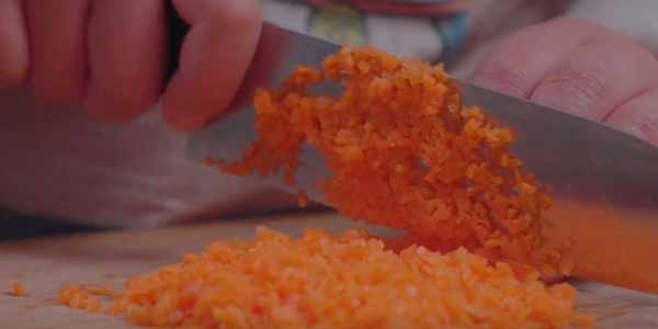 4.準備半根胡蘿卜,先切成片,再切成條,最後切成小碎丁。放在一邊備用。