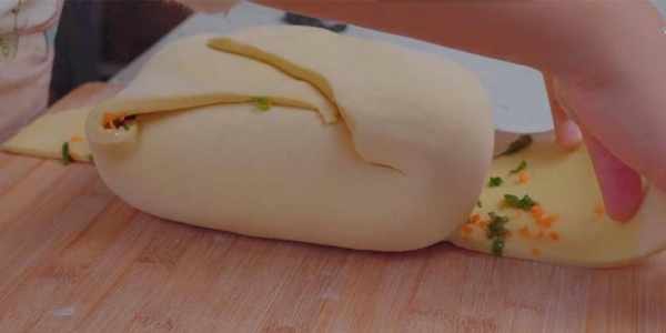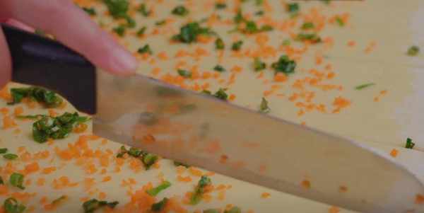 8.在表面塗抹上一層油,再撒上胡蘿卜跟蔥花,用刀在兩端邊緣切上三刀。