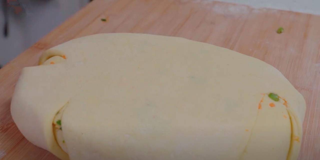 10.包好瞭再用搟面杖稍微搟一下。