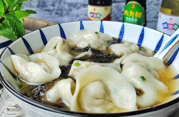 9、湯碗裡邊加入蝦皮,紫菜,蔥末,香油,再來上大半碗煮餛飩的湯,有條件的用高湯,最後把煮熟的餃子放進去即可