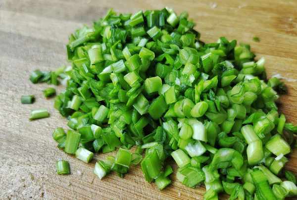 2、韭菜要提前洗凈,把水分晾幹,切成末,最好是用根部的這一邊,葉子可以用來做蛋餅之類的,根部口感會更好,而且還不會出水