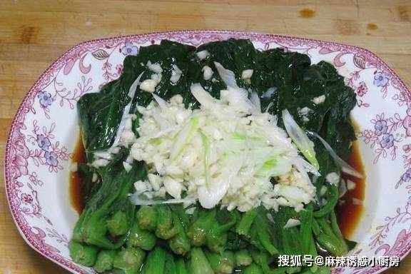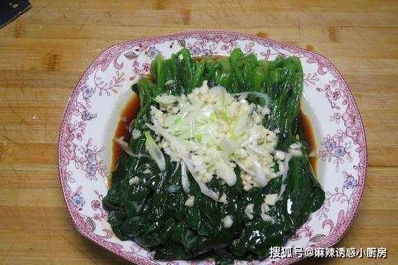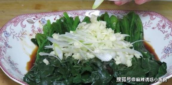 4、將調好的料汁倒入焯水好的菠菜中,然後放上切好的蒜和蔥片