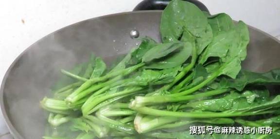 2、鍋中加入適量的清水,大火燒開,然後將準備得好的菠菜焯水,大約焯水半分鐘左右即可,將焯水後的菠菜撈出擺入盤中