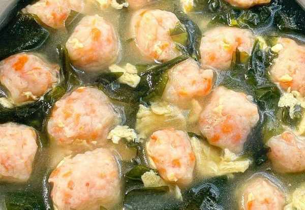 4、水開後,轉成小火,擠入蝦丸煮一會兒,煮至浮起來之後,淋入雞蛋液,煮熟後加入適量食鹽調味,撒上蔥花即可出鍋開吃。