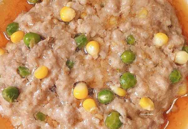 1、豬肉清洗幹凈剁成肉末,放入薑末、豌豆粒、玉米粒、淀粉和食鹽,抓拌均勻。再淋入一點蔥薑水,再次攪拌均勻,整理平整。