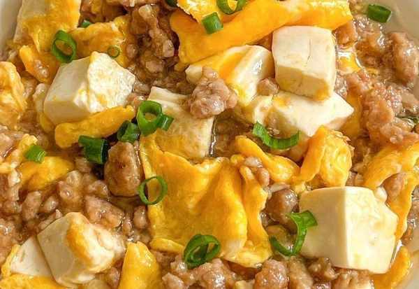 4、再次起鍋燒油,油熱後放入嫩豆腐煎一下,再倒入雞蛋液煎熟,煮至定型後放入肉末翻炒均勻。