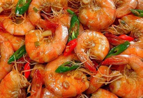 1、大蝦去掉蝦頭和蝦線,清洗幹凈後瀝幹水分備用。青線椒和小米辣去蒂洗凈後斜切成片。