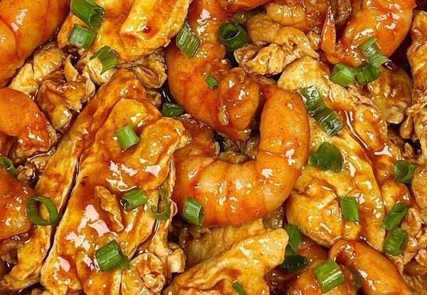 4、接著放入蝦仁和醬汁,燜煮一會兒。煮至醬汁濃稠,開大火翻炒收汁,撒上蔥花即可出鍋裝盤開吃。