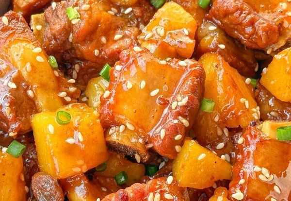 5、煮至醬汁濃稠,放入菠蘿翻炒均勻,炒入味後撒上白芝麻和蔥花即可出鍋開吃。