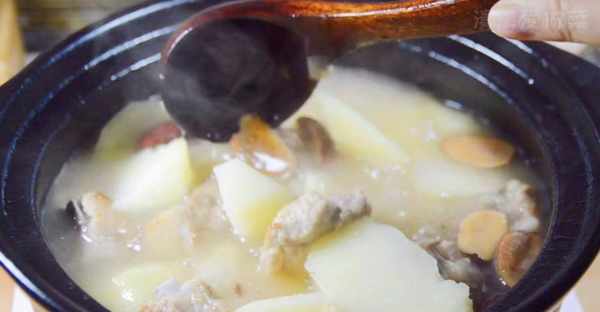 第五步:放入砂鍋中煮。準備一個砂鍋,將切好的土豆放入鍋中,然後將煮熟的排骨立即倒入鍋中。蓋上蓋子,用中火慢燉20分鐘。20分鐘後,打開蓋子,香味就會出來!在這一點上,不必急於加鹽。用勺子攪拌均勻,打開蓋子燉2分鐘,然後加入食用鹽。攪拌均勻,然後加入一把幹凈的紅棗,蓋上蓋子燉5分鐘。5分鐘後,打開蓋子,加入一點蔥花以增強香氣。這時,排骨湯就煮好瞭。這樣煮出來的湯又濃又白,營養豐富,味道鮮美。