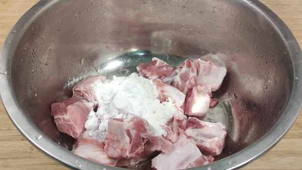 將排骨放在一個大碗中,加入一勺鹽,然後加入一勺面粉,最後加入一勺小蘇打。然後用手抓勻,試著把每一塊排骨都裹上面粉。鹽有很好的殺菌消毒作用,而面粉有很強的吸附能力,小蘇打對肉類有極好的去污軟化作用,可以徹底清潔排骨表面的細菌和雜質。