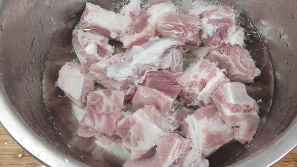 我們需要用溫水清洗提取出來的排骨表面漂浮的泡沫,並且記得不要用冷水清洗,否則排骨的肉會因為溫度的劇烈變化而急劇收縮,導致味道暗淡。將排骨洗凈,自然瀝幹表面水分。